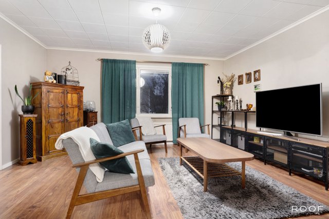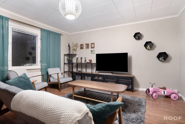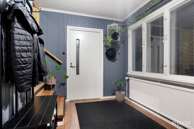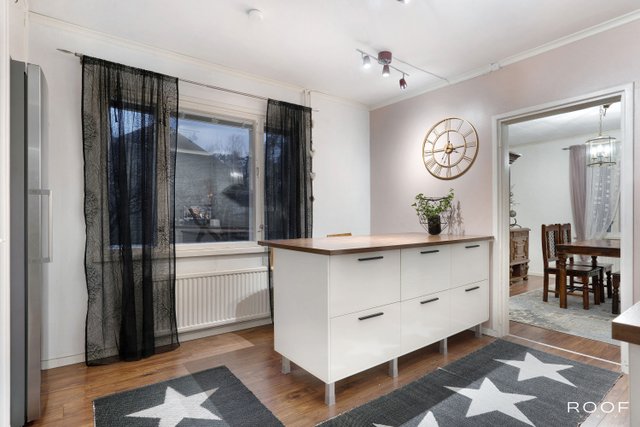 Asuinkerroksissa sijaitsevat olohuone, keittiö, ruokailutila sekä useampi makuuhuone, jotka jakautuvat selkeästi eri kerroksiin. Keittiö on remontoitu ja varustettu nykyaikaisilla kodinkoneilla. Olohuone ja ruokailutila sijoittuvat vierekkäin ja ovat selkeästi kalustettavissa. Yläkerrassa sijaitsevat makuuhuoneet tarjoavat omaa rauhaa, ja kerroksessa on lisäksi erillinen wc. Kokonaisuus toimii hyvin niin perheen arjessa kuin etätyössä.