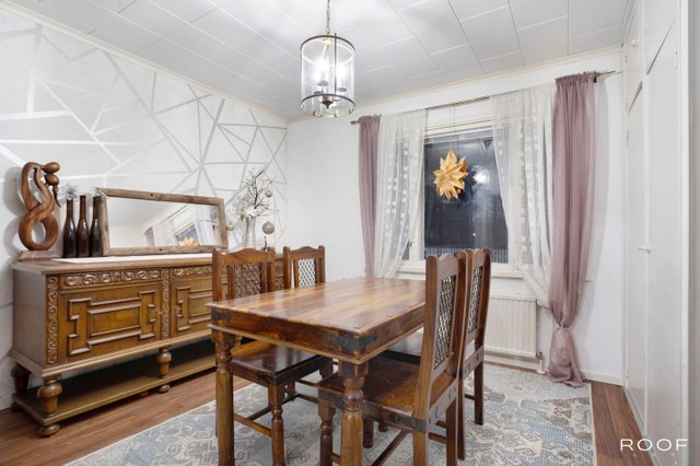 - Alkuperäisessä pääpiirutuksessa ei ole määritelty m2. Rakennus- ja huoneistorekisterioteen (epävirallinen) 15.12.2025 mukaan huoneistoala on 95 m2, kerrosala 144 m2 ja kokonaisala 216 m2. Kellarin pinta-ala (muut tilat) on 72 m2. Edellä mainitut pinta-alat saattaa tämän ikäisessä kohteessa poiketa olennaisestikin asuinrakennusten nykyisten mittaustapojen ja standardien mukaan laskettavasta asuintilojen pinta-alasta. Asuinrakennuksen todellinen asuinpinta-ala voi täten myyntiesitteestä ja ilmoitetusta tiedosta poiketa olennaisesti. Hinta ei määräydy pinta-alan perusteella, vaan perustuu kiinteistöön kokonaisuutena. Todellisen asuinpinta-alan selvittämiseksi suositellaan tarkistusmittausta.