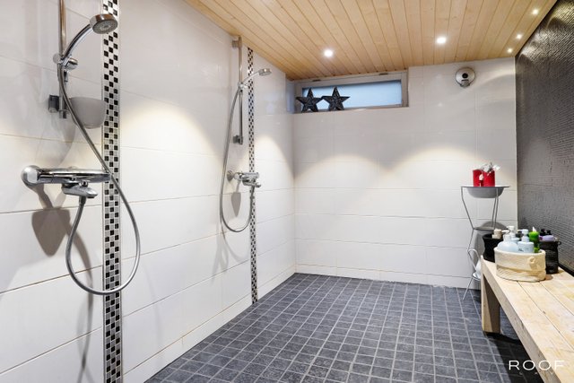 - Varustus: kaksi suihkua, hana, lattialämmitys Seinät: laatoitetut Lattia: laattalattia Lisätiedot: tilava ja valoisa kylpyhuone, ikkunallinen tila, kattoon upotetut valaisimet