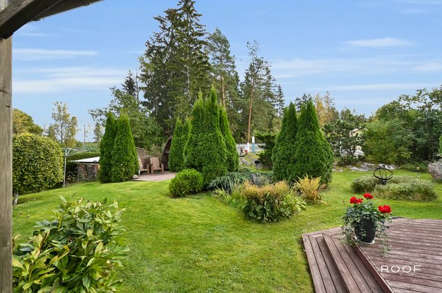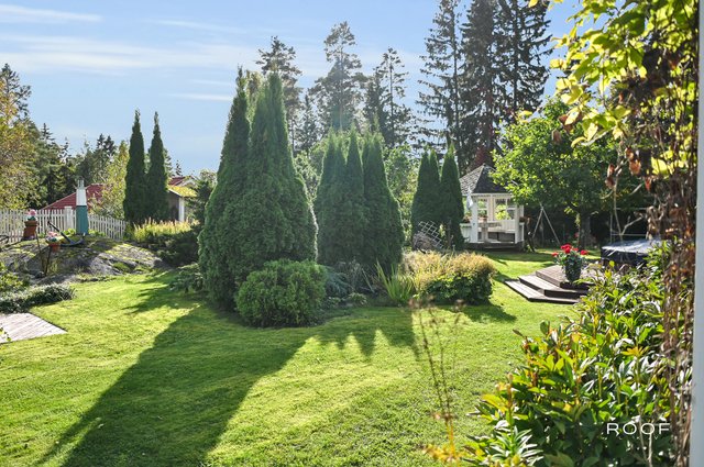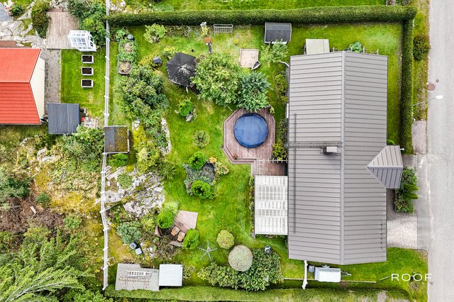 Egen ca 1000m2 tomt vid väg med återvändsgränd. Välskött bakgård med planteringar, lekstuga, förråd samt uteplats och simbassäng.