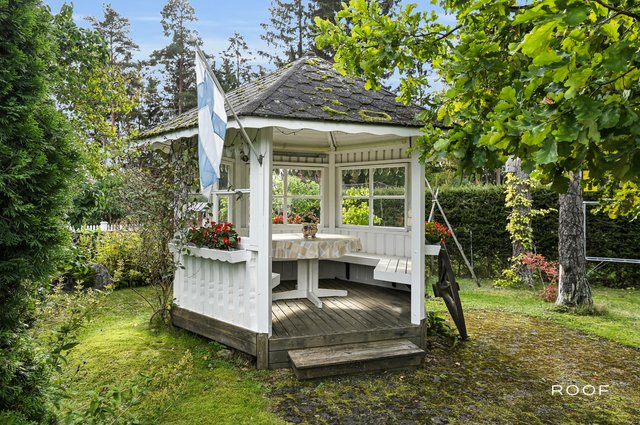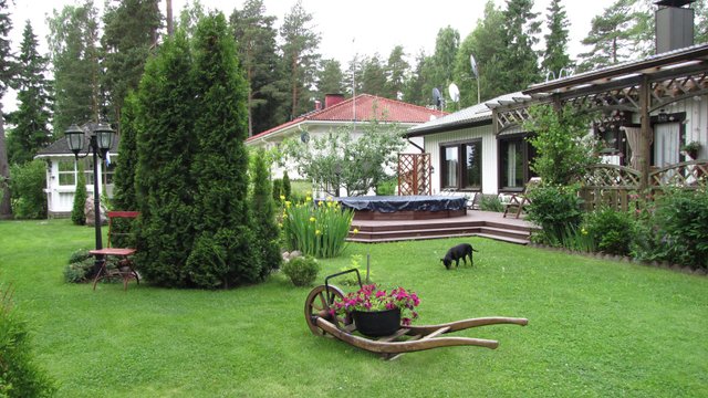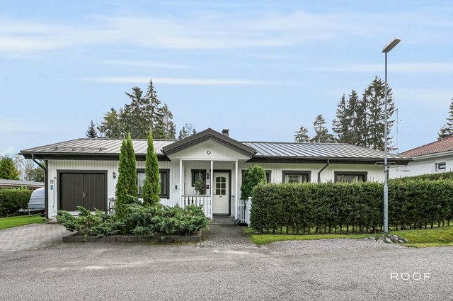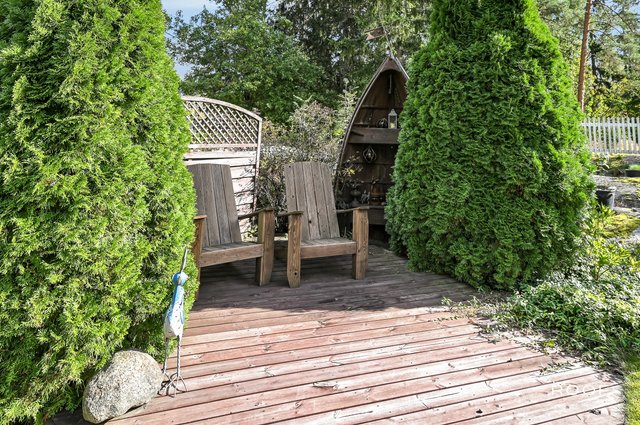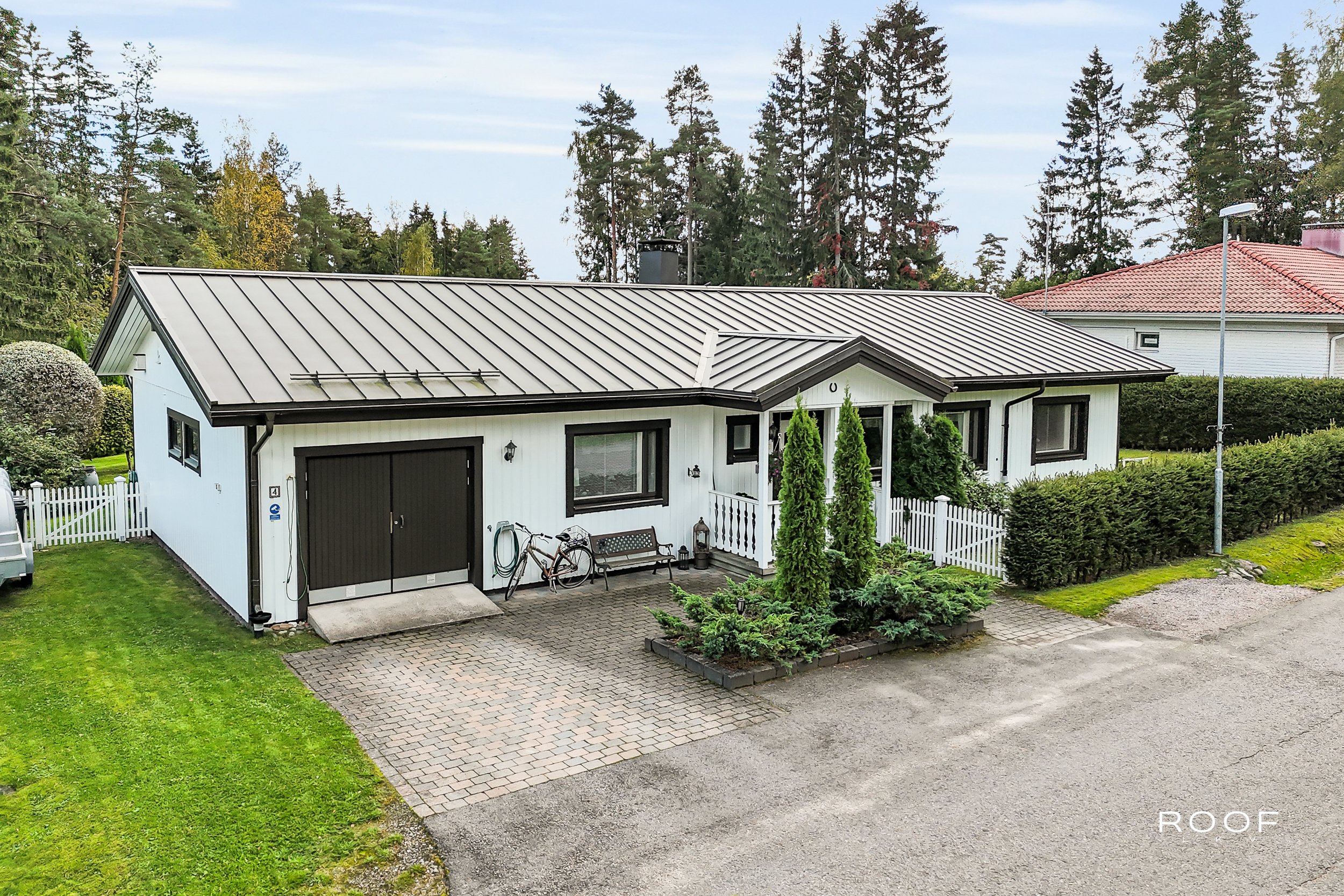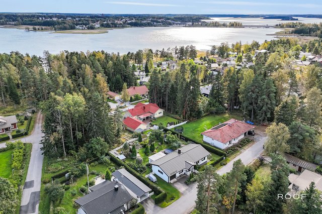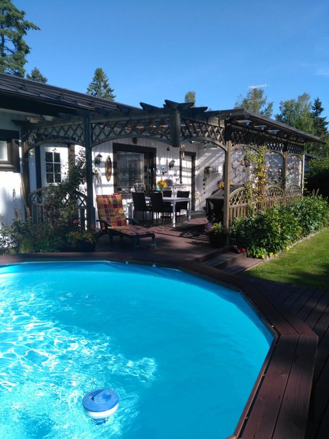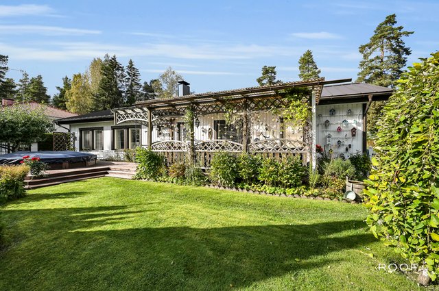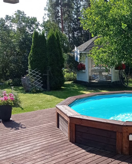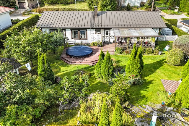 Oma noin 1000 m² tontti päättyvän tien päässä. Hyvin hoidettu takapiha istutuksineen, leikkimökki, varasto sekä ulkoterassi ja uima-allas.