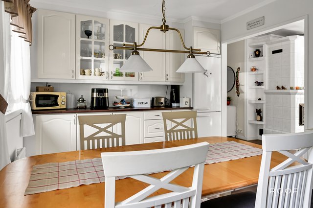 Uppdaterade och fräscha ytor. Optimerad eluppvärmning med kompletterande lagrande kakelugn samt en luftvärmepump.