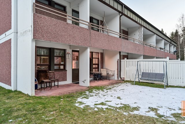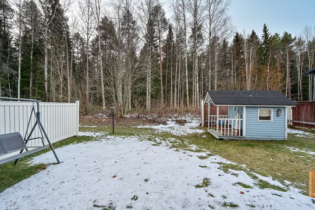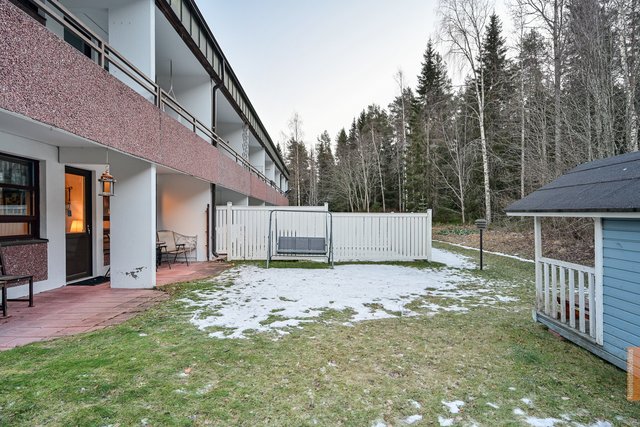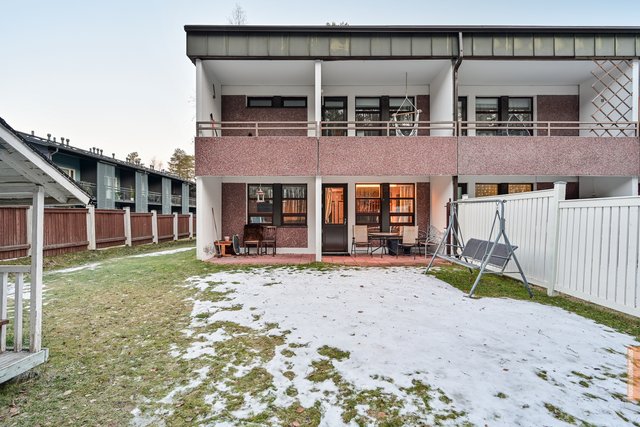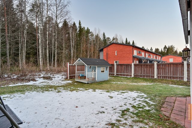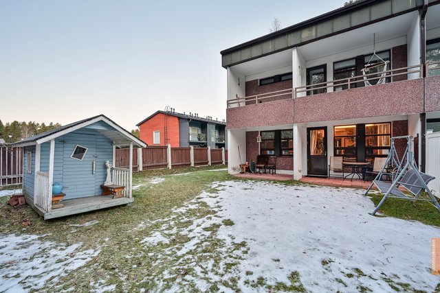 Päätyhuoneisto ja mahtava takapiha leikkimökkeineen metsään päin.