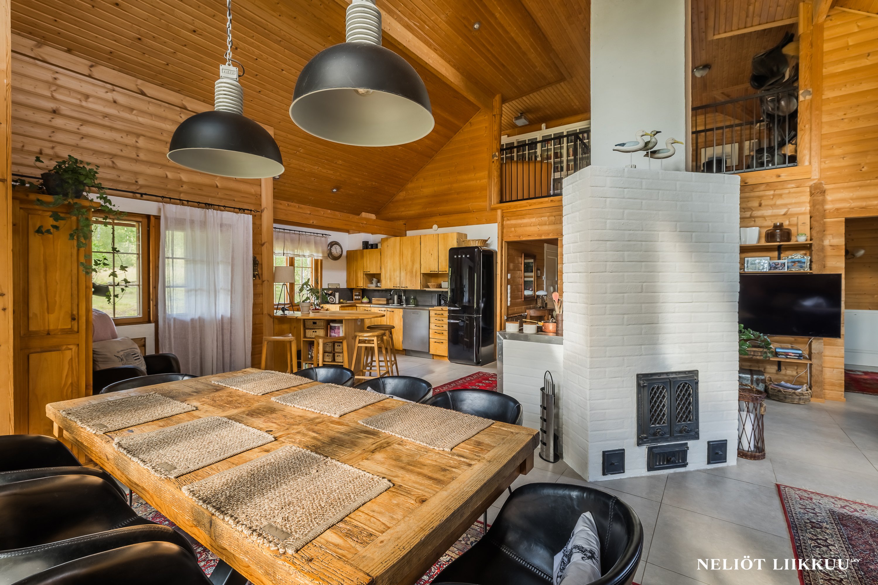 Korkea olohuone tuo tilan tuntua ja luonnonvaloa suurten ikkunoiden kautta. Lämmönlähteenä toimii jykevä takka, joka luo tunnelmaa viileinä iltoina. Keittiö on varusteltu moderneilla laitteilla, ja puuliesi tuo perinteistä tunnelmaa. Siinä on mukava keitellä vaikka pannukahvit aamupalalle.