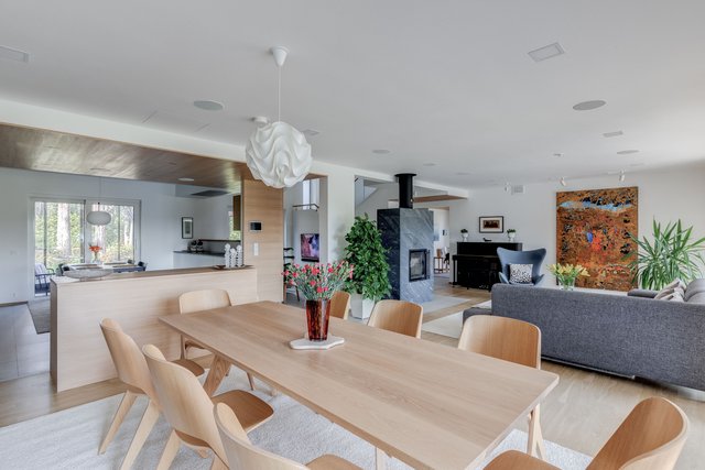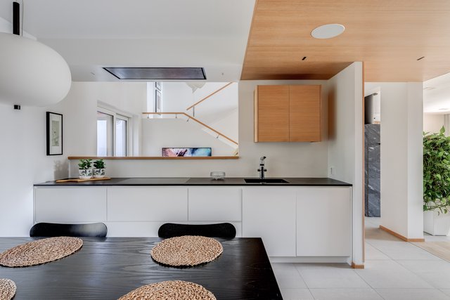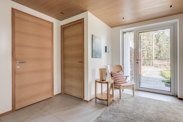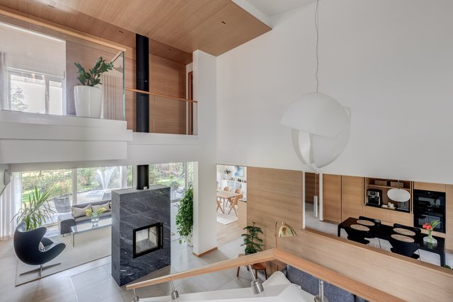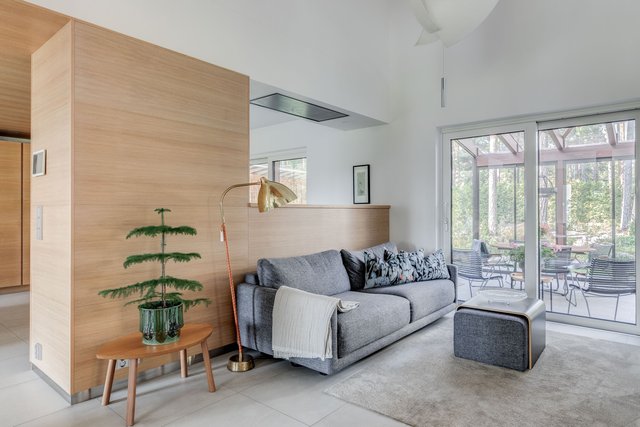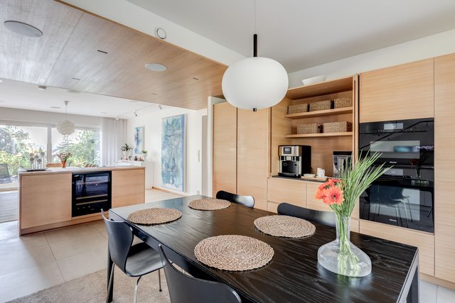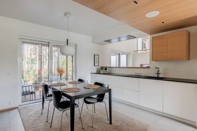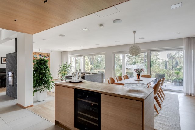 Talon sydän on valoisa olohuone, jossa suuret lasiliukuovet yhdistävät sisä- ja ulkotilat saumattomasti. Varaava takka luo lämpöä ja tunnelmaa viileinä iltoina. Keittiö on puusepän käsityönä valmistettu, ja varusteltu huippuluokan Mielen kodinkoneilla. Täällä on ilo kokata ja viettää aikaa perheen ja ystävien kanssa.