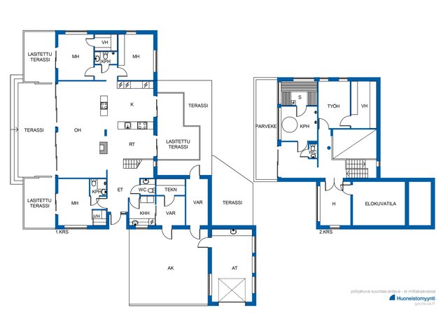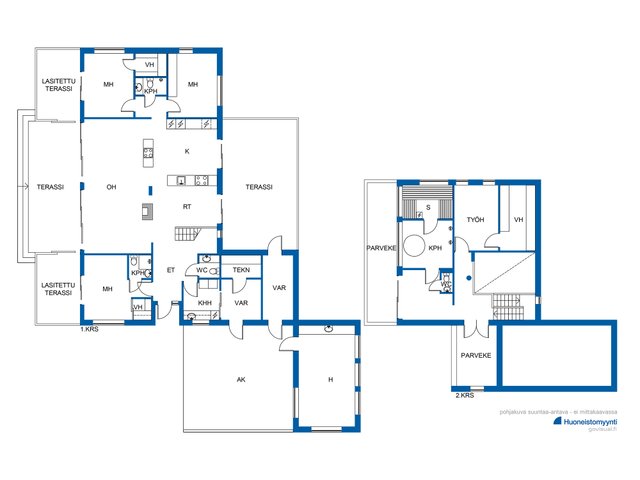 - Omakotitalon virallinen huoneistoala on 274,5 m2. Tämän lisäksi on; - toisessa kerroksessa kaksi varastotilaa (toinen elokuvien katselutilana), yhteensä 23 m2 - lämmin, tällä hetkellä kuntoilutilakäytössä oleva autotalli, 29,0 m2 - väljä, kahden auton autokatos, 56 m2 - lasitettuja terasseja takapihalla, 32 m2 - lasitettuja terasseja etupihalla, 21 m2 - katettu parveke etupihalla, 23 m2 - katettu terassi etupihalla, 23 m2. Virallisen huoneistoalan lisäksi siis katettuja tiloja on yhteensä n. 207 m2.