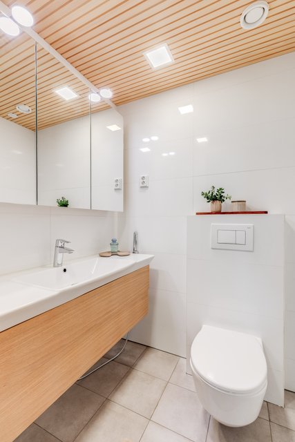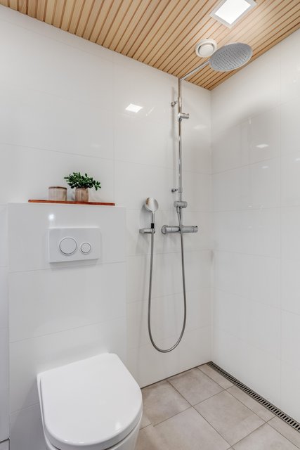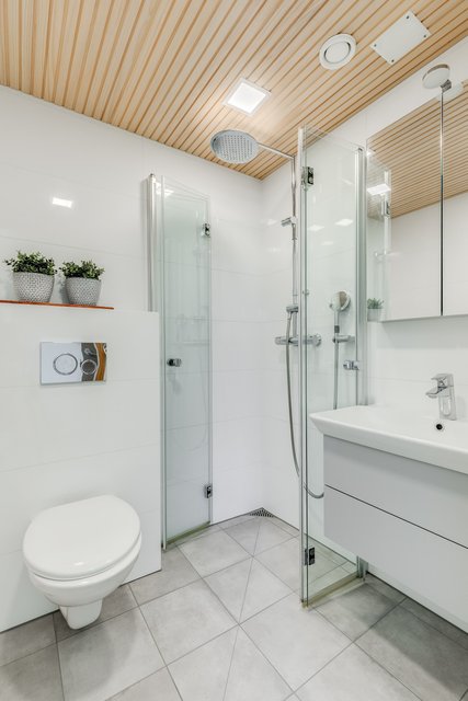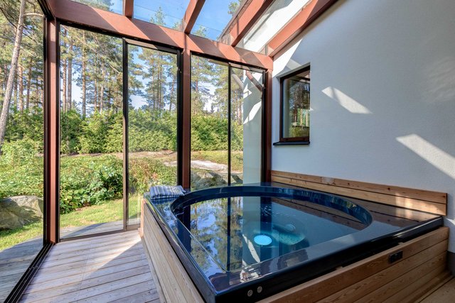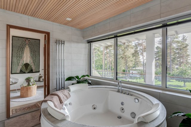 - Alakerrassa on kaksi kylpyhuonetta ja yksi erillinen wc, sekä kodinhoitohuone. Yläkerrassa on iso saunaosasto ja erillinen wc. Saunaosastolla on kaksi suihkua ja poreamme. Saunassa on Tulikiven sähkökiuas. Kaikki wc:t ja märkätilat on täysin laatoitettuja ja kaikissa tiloissa on lattialämmitys. Märkätilojen ja wc-tilojen alakattopaneloinnit ovat oksatonta lehtikuusta, joka on erikoistilauksena höyläytetty Saksasta tuodusta tukkipuusta. Saunaosastolla on n. 30 000 euron arvoinen Jaquzzi-sisäporeamme.