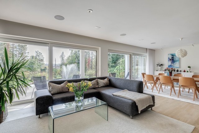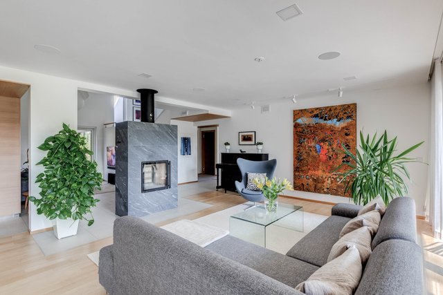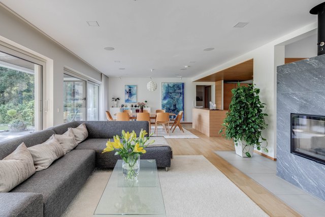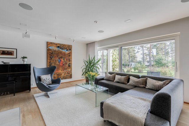 - Lattiamateriaalina on alustaan liimattu perinteinen tammiparketti. Lattiaurakoitsijana toimi Romanoff Oy. Valoisa ja iso olohuone, josta on käynti pihalle. Lumir akustiikkakatto, integroidut kaiuttimet. Tulikiven varaava takka. Olohuoneen suuret lasiliukuovet avautuvat tarvittaessa sivulle ja muodostavat huikean 5 m aukon sisätilan ja ulkotilan välille.