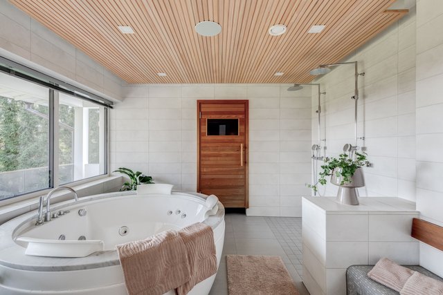 Yläkerran saunaosasto on oma rauhoittava keitaansa, jossa Tulikiven sähkökiuas ja poreamme tarjoavat ylelliset puitteet rentoutumiseen. Kolme kylpyhuonetta ja erilliset wc-tilat takaavat arjen sujuvuuden isommallekin perheelle.