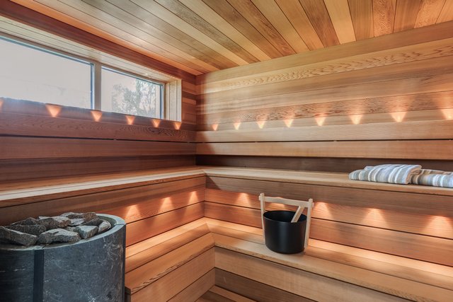 - Yläkerrassa on iso saunaosasto. Tulikiven sähkökiuas. Sauna on tilava ja sen pintamateriaalina on tuija-puuverhous. Myös lauteet ja saunaosaston ovet ovat tuijapuuta
