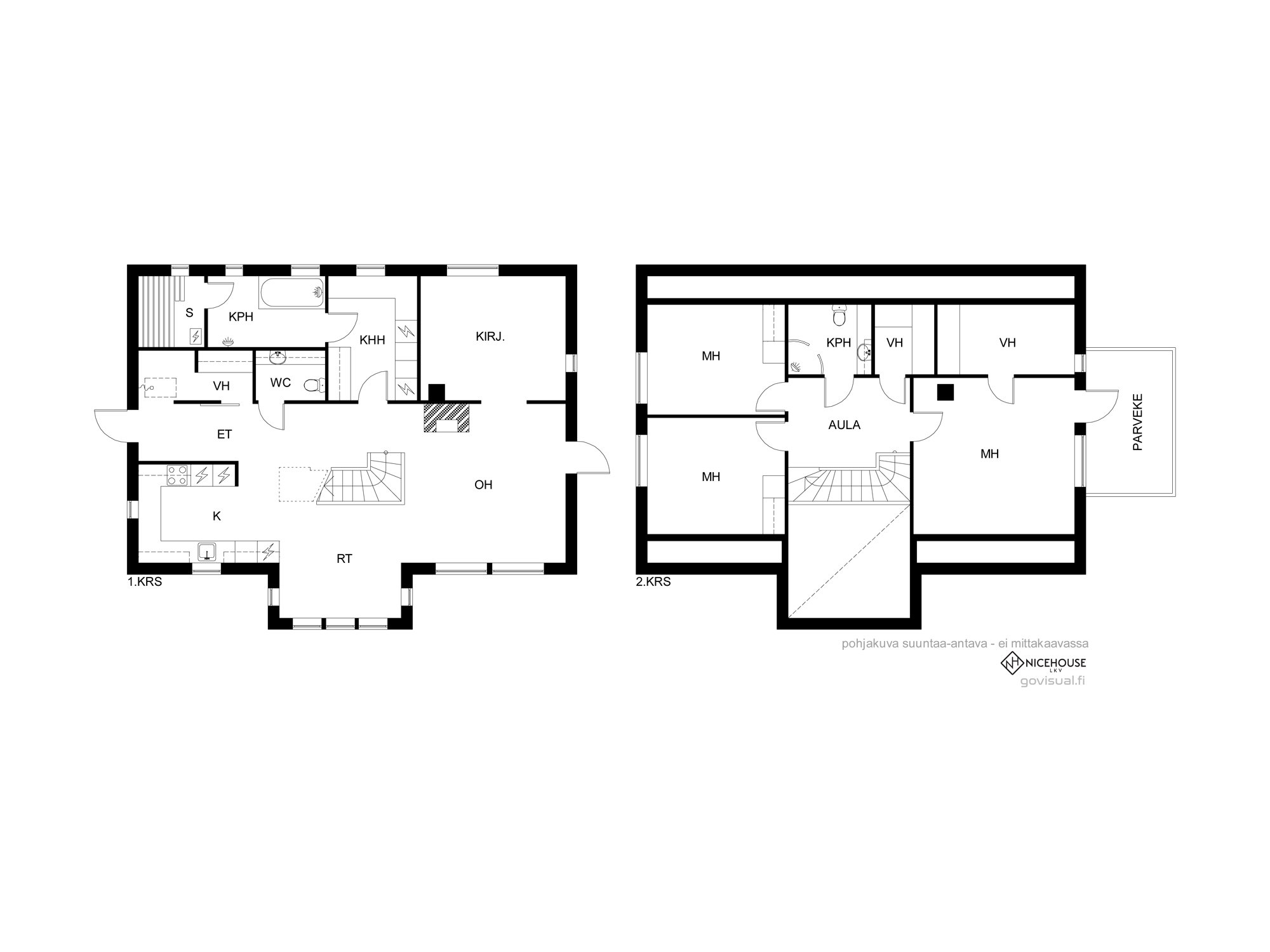 - Alakerran kph: suihku, kylpyamme, hana Yläkerran kph: suihku, suihkuseinä, wc-istuin, pesuallas, allaskaapisto, peili