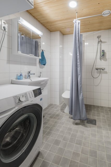 - WC-istuin, suihku, pesukoneliitäntä, lattialämmitys, peilikaappi, bidee-suihku, allaskaappi, ja pesuallas