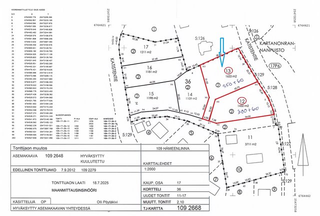 Määräala tulee muodostamaan Hämeenlinnan kaupungin asemakaavatontin 109-17-36-13. Os. Kartanonrannantie 14 on mahdollisuus rakentaa unelmiesi talo: rakennusoikeus on 350 krs -m2 + 60 krs-m2. Määräala sijaitsee rauhallisella alueella, jossa yhdistyvät luonnonläheisyys ja hyvät liikenneyhteydet. Myyjä vastaa kohteen lohkomiskuluista. Kunnallistekniikkaan liittyminen on mahdollista Kartanonrannantien puolelta.