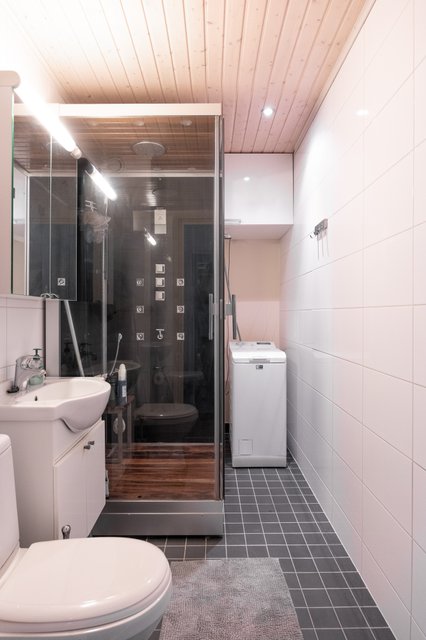 - Varustus: WC-istuin, bidee, allaskaappi, peilikaappi, suihkukaappi, pesukoneliitäntä, sähköinen lattialämmitys ja kiinteät valaisimet. Materiaalit: Lattia-ja seinäpinnat laatoitettu.