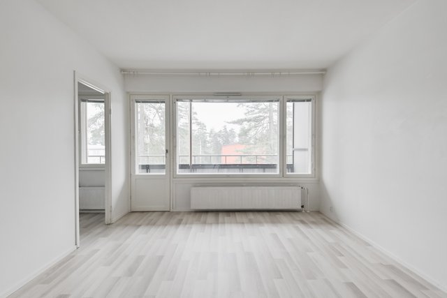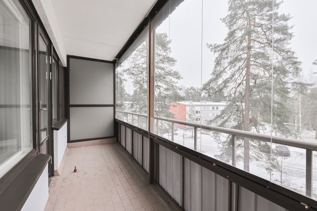 Tässä ylimmän kerroksen asunnossa on valoisa olohuone, jonka yhteydessä on alkovi tila, keittokomero ikkunalla, kylpyhuone, eteinen säilytyskaapistoilla sekä tilava lasitettu parveke. Parvekkeelta aukeavat ihastuttavat näkymät luontoon.