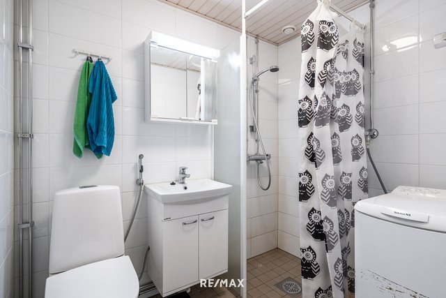 - WC-istuin, suihkuseinä, pesukoneliitäntä, peilikaappi, pesuallas, allaskaappi, ja bidee-suihku