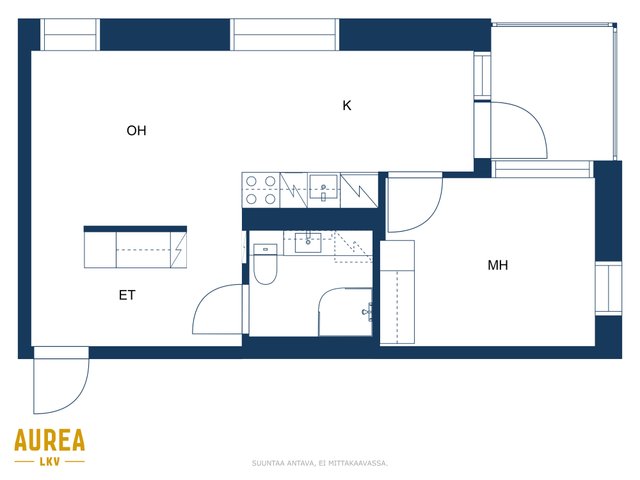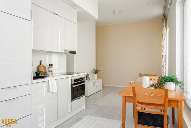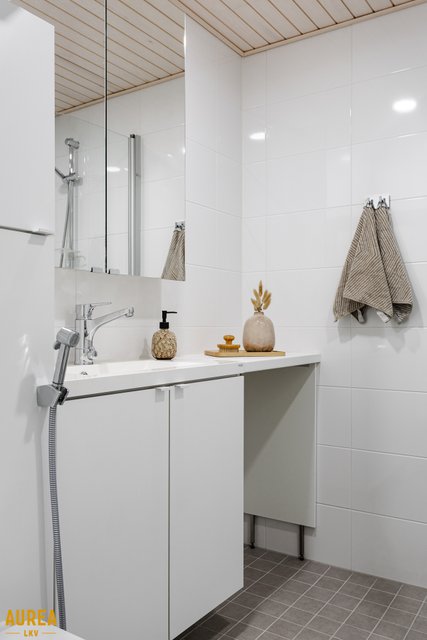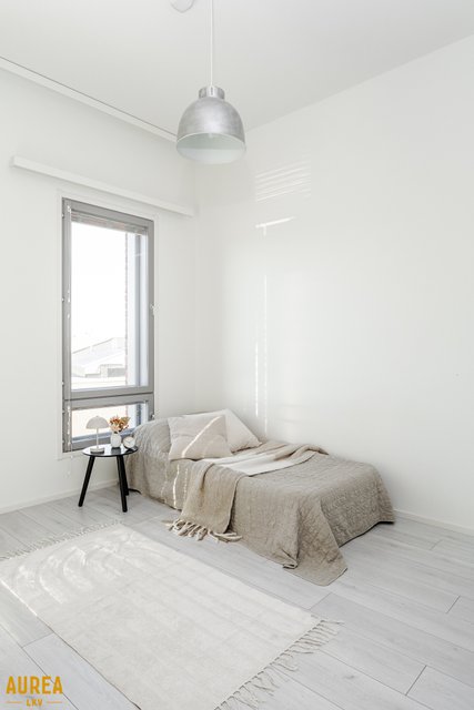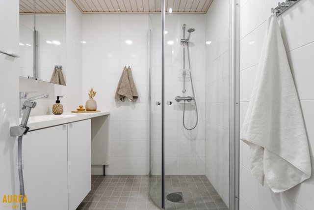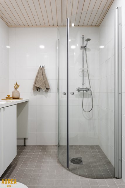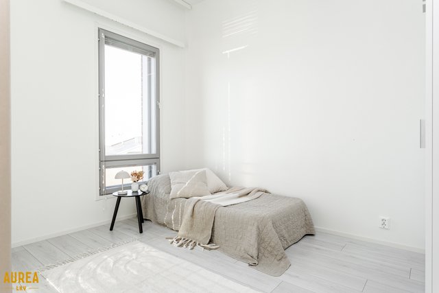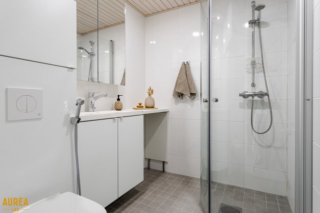Tässä kodissa tilat on käytetty tehokkaasti ja normaalia korkeampi huonekorkeus tuo reilusti avaruutta. Keittiö ja olohuone muodostavat toimivan kokonaisuuden, jossa kaikki on helposti saavutettavissa. Makuuhuone tuo lisää yksityisyyttä ja mukavuutta arkeen. Keittiöstä löytyvät modernit ja laadukkaat kodinkoneet, ja kylpyhuoneessa on hyvin tilaa myös pesukoneelle.