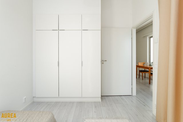 - Tilava makuuhuone, jossa kaapistot. Makuuhuoneesta isot ikkunat parvekkeelle ja kaupungin suuntaan.