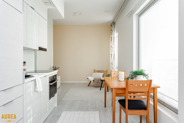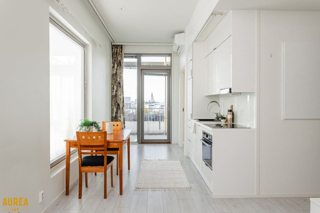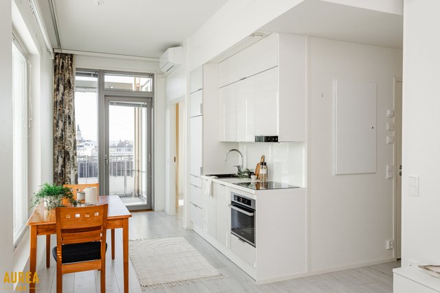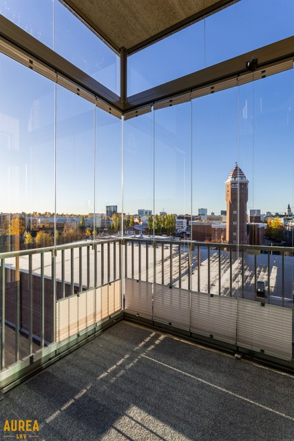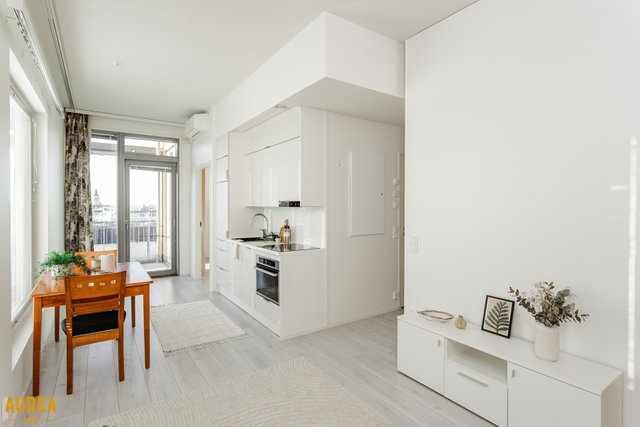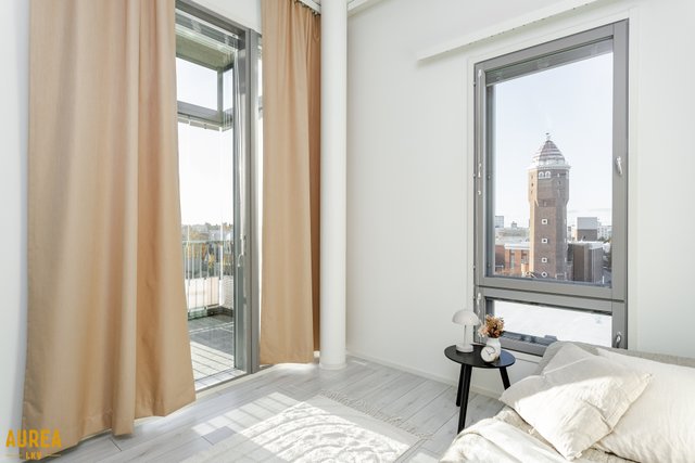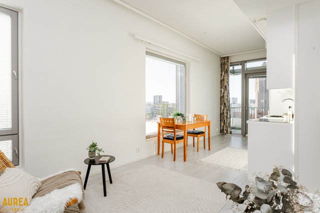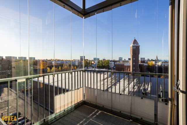 Moderni kaksio lasitetulla parvekkeella ja kaupunkinäkymillä – 7. kerroksen koti hyvällä sijainnilla!