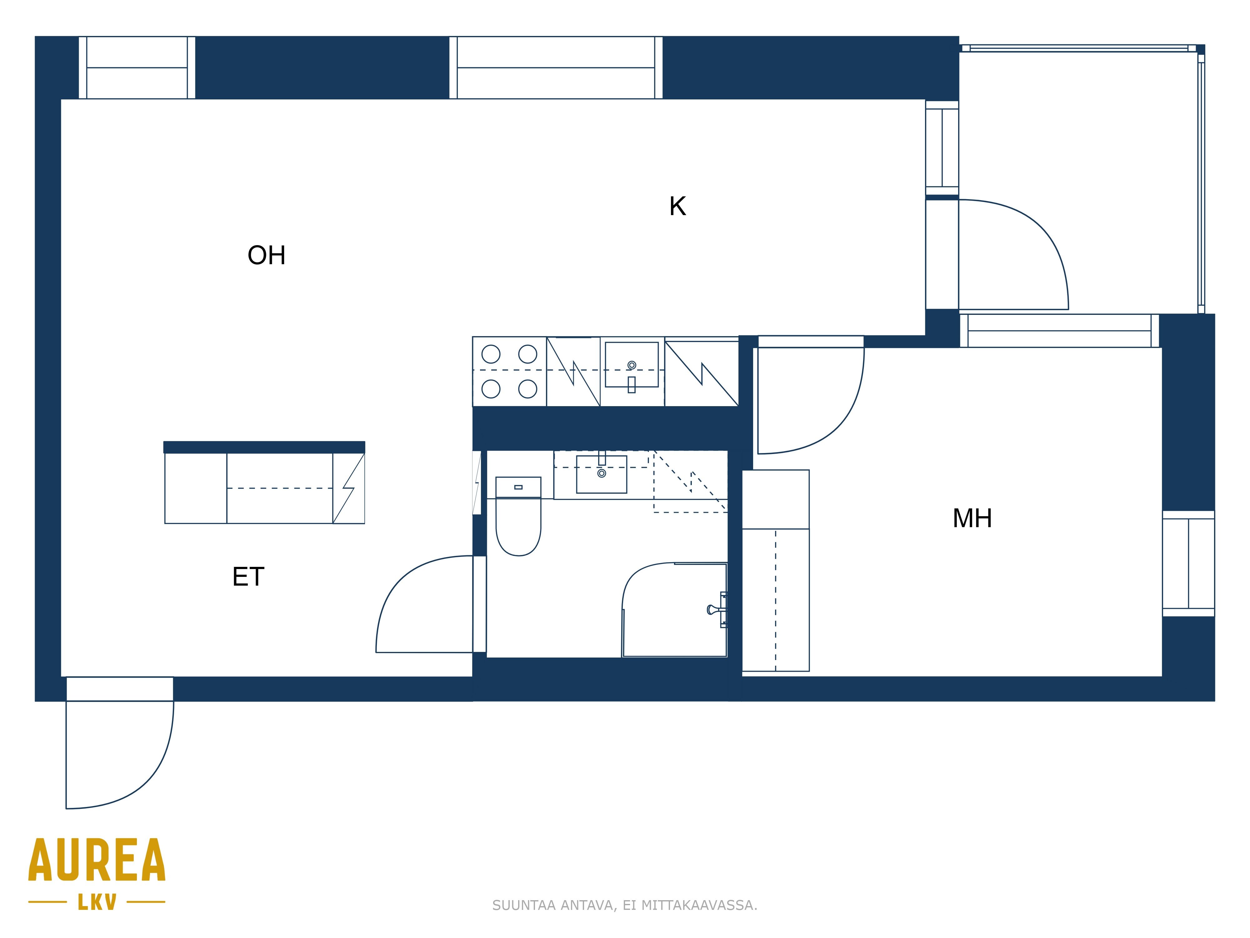 - Keittiö kivasti yhtenäistä tilaa olohuoneen kanssa. Isot ikkunat olohuoneesta ja keittiöstä. Keittiössä viilentävä ilmalämpöpumppu.