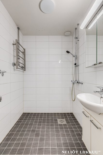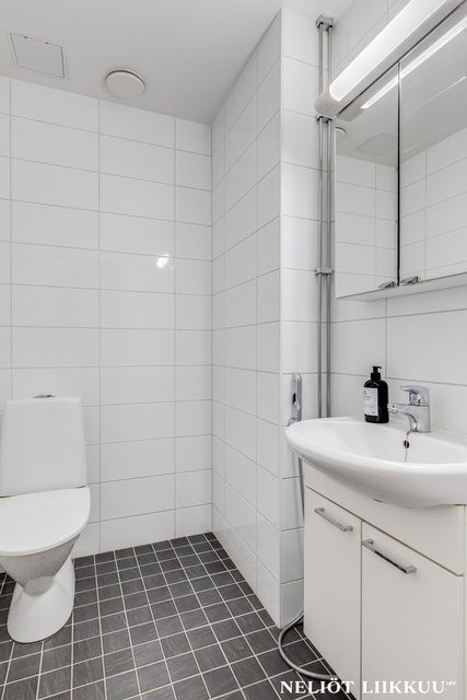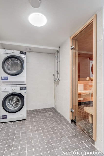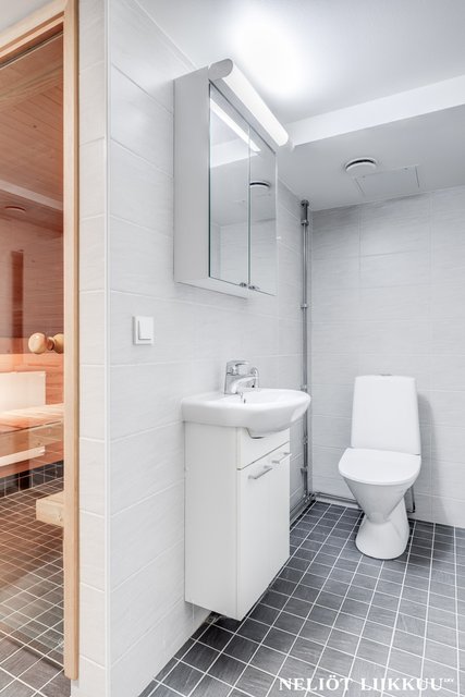 - WC-istuin, suihku, pesukoneliitäntä, peilikaappi, bidee-suihku, allaskaappi, pesuallas, ja lattialämmitys