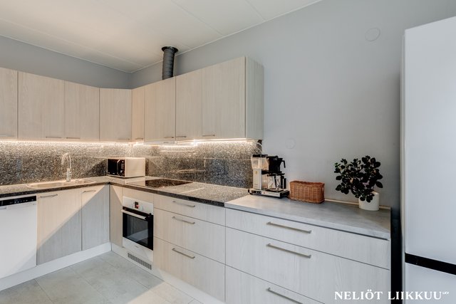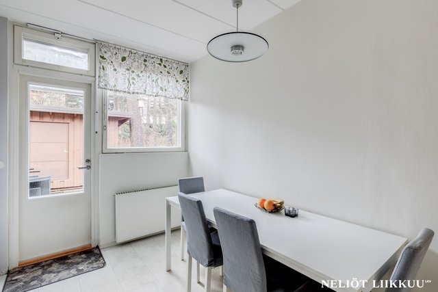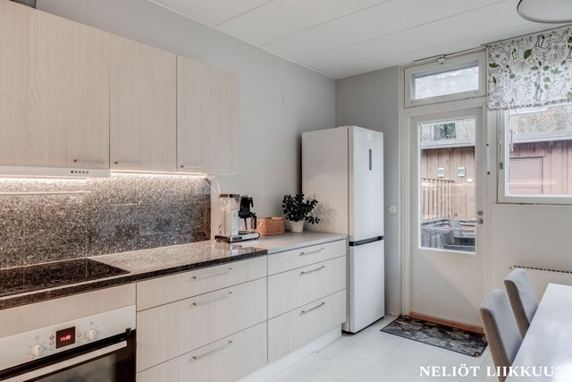 - Tilava, erillinen keittiö tarjoaa runsaasti laskutilaa ja paikan myös isommalle ruokapöydälle, täydellinen koko perheen yhteisiin hetkiin. Keittiöstä avautuu käynti suoraan asunnon omalle takapihalle, mikä tekee arjesta sujuvaa ja tuo ripauksen lisää viihtyisyyttä.