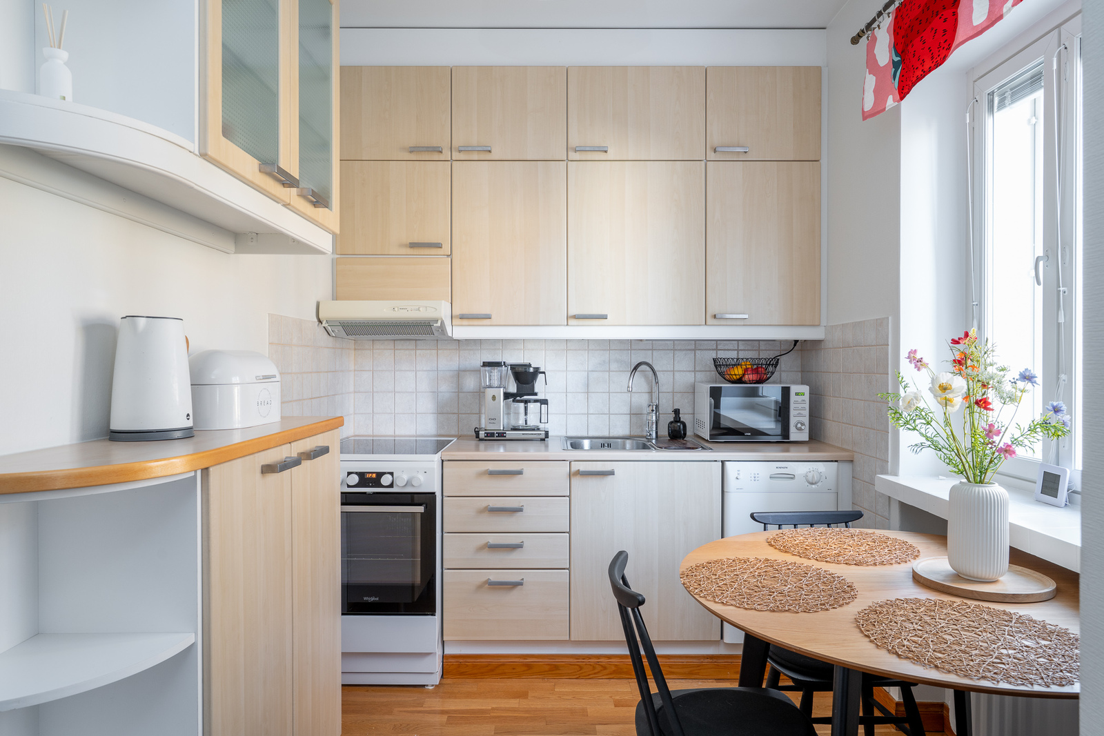 - Keittiö remontoitu 2004. Lattia parkettia, seinät maalattu. Jääkaappi-pakastin, keraaminen liesi, kiertoilmauuni, liesituuletin.