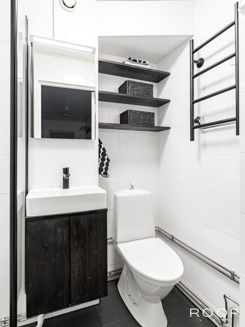 - WC-istuin, suihku, pesuallas, allaskaappi, ja peilikaappi