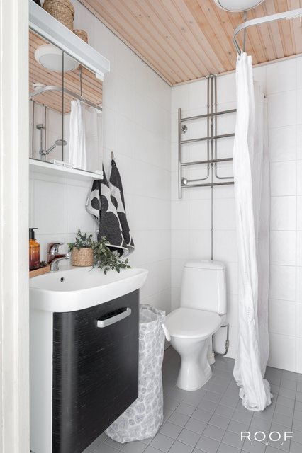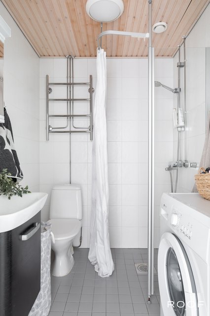 - VARUSTUS: Suihku, suihkuseinä, wc-istuin, pesukoneliitäntä, hana, allas, peilikaappi, allaskaapisto, lattialämmitys. SEINÄT: Laatta. LATTIAT: Laatta.