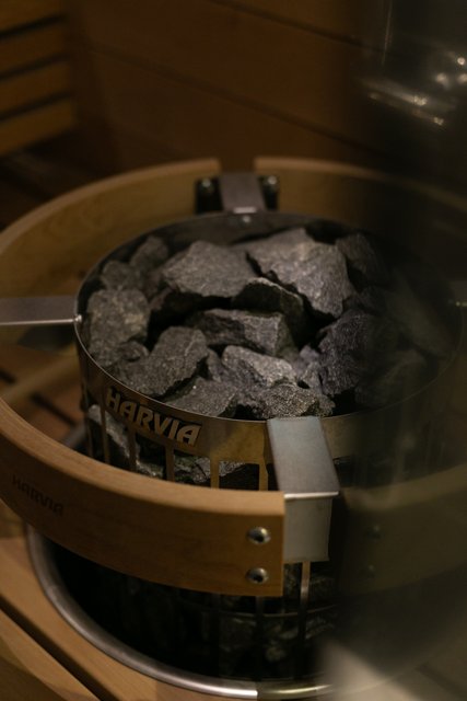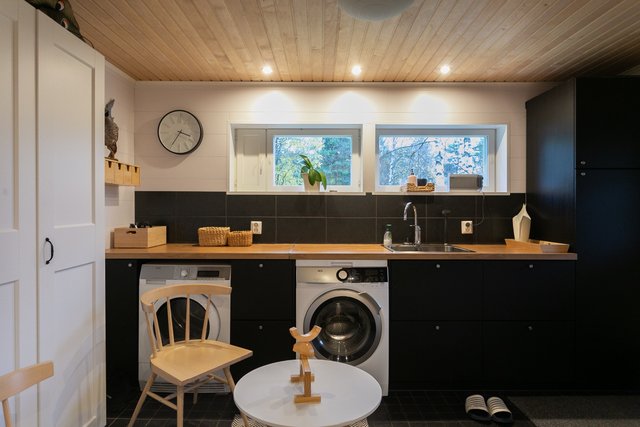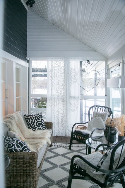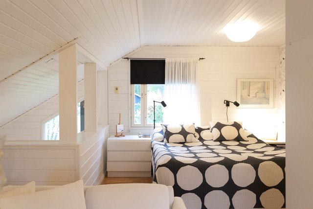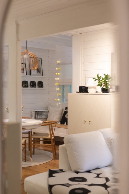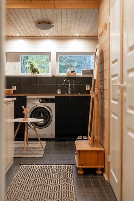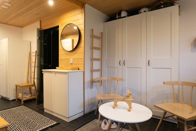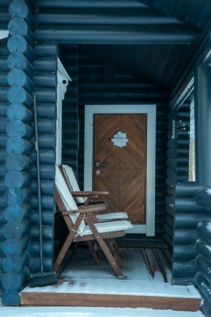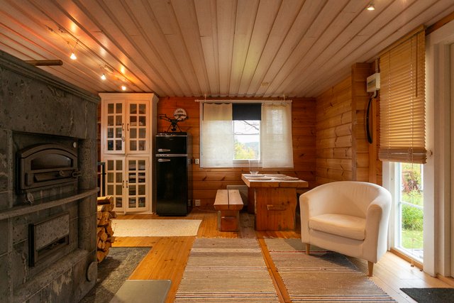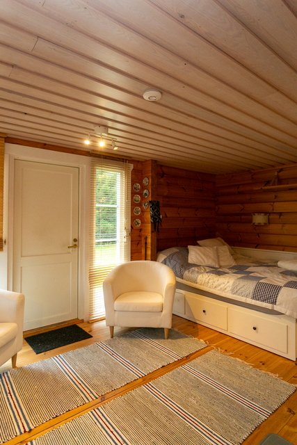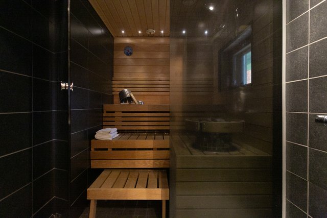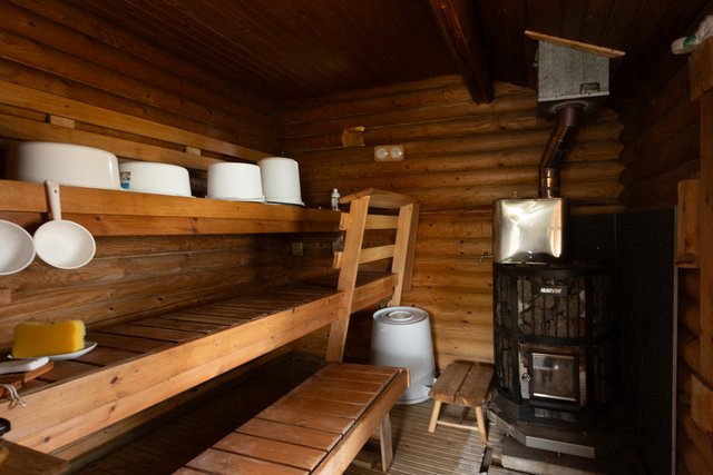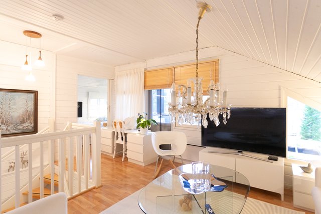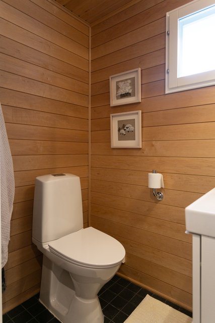 Huvilassa on kaksi wc:tä, tilava sauna sähkökiukaalla sekä lasitettu terassi, joka toimii puolilämpimänä tilana, josta on upeat näkymät järvella ja sen takana piirtyviin vaaramaisemiin.
