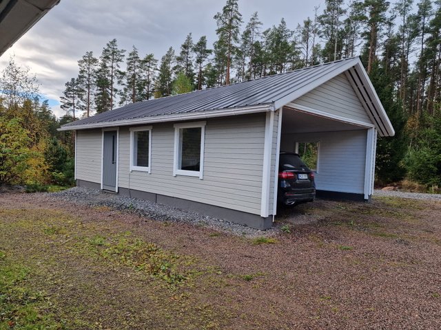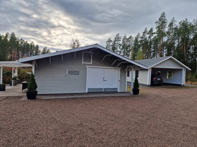 - 2 auton autokatos+ puuvarasto. Talousrakennus, jossa: ulkosauna, varastohuone sekä autotalli. Varastorakennus.