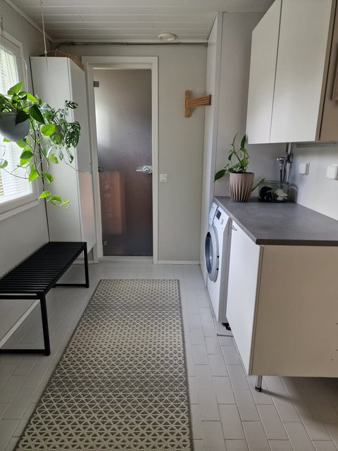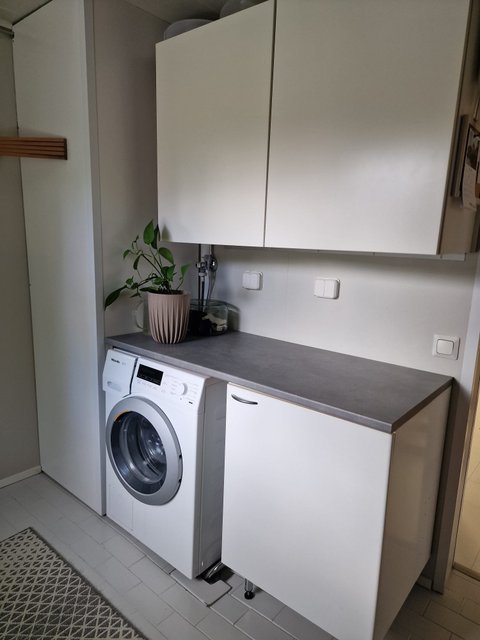 - Pöytätaso, lämminvesivaraaja, pesukoneliitäntä, ja lattialämmitys