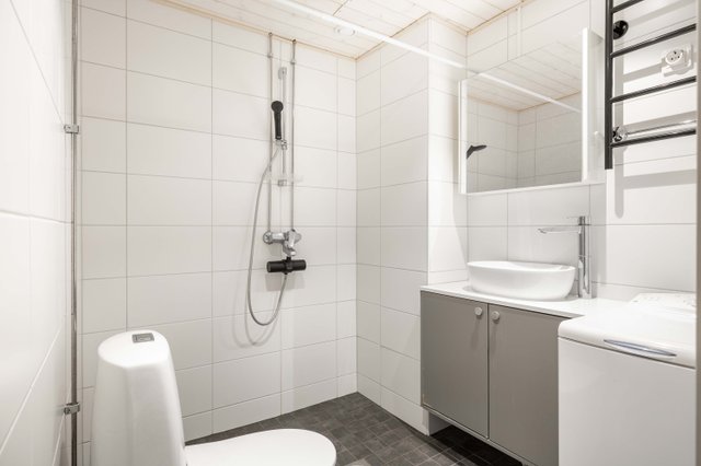 - WC-istuin, suihku, lattialämmitys, allaskaappi, pesukoneliitäntä, ja peilikaappi