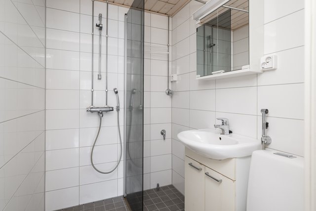 - WC-istuin, suihku, pesukoneliitäntä, peilikaappi, pesuallas, ja bidee-suihku