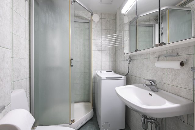 - WC-istuin, suihku, pesukoneliitäntä, bidee-suihku, ja peilikaappi