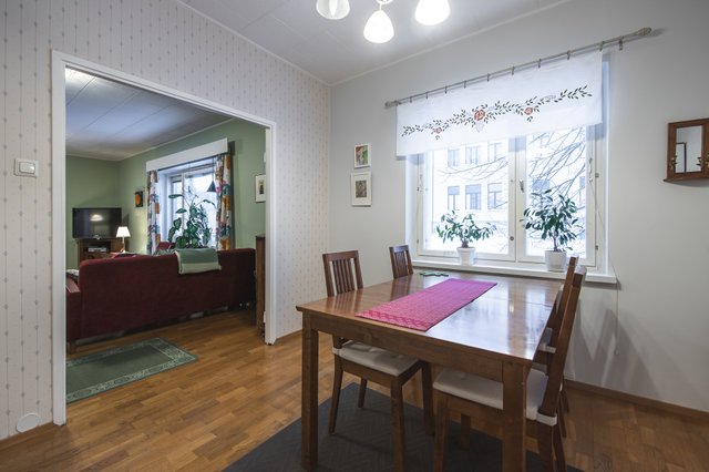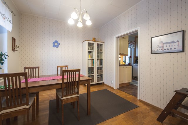 - Ruokailutilan lattiassa parketti, seinissä maalia, sekä tapettia