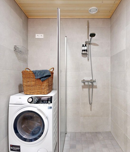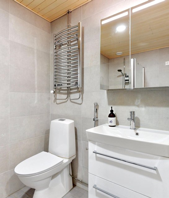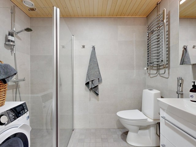 - VARUSTUS: Suihku, Suihkuseinä, WC-istuin, Allaskaappi, Hana, Peilikaappi, Lattialämmitys. Pyyhekuivain, Pesukoneliitäntä. SEINÄ: Laatta. LATTIA: Kaakeli.