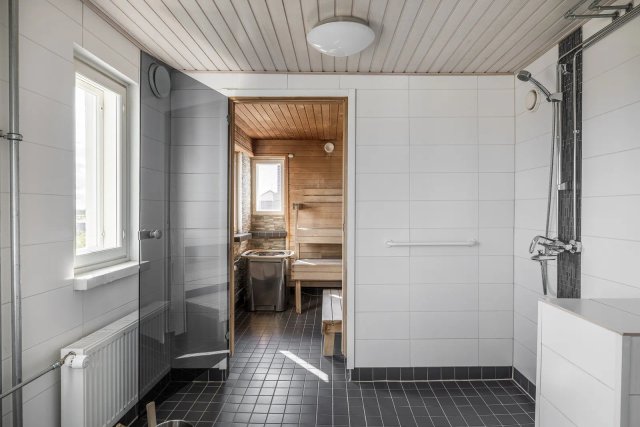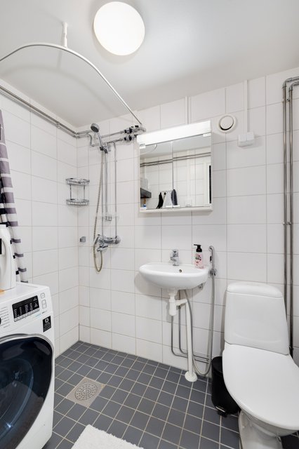 - WC-istuin, suihku, pesukoneliitäntä, lattialämmitys, pesuallas, peilikaappi, ja bidee-suihku