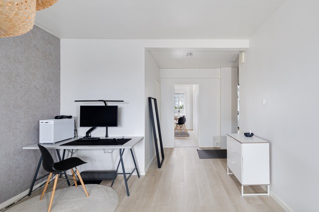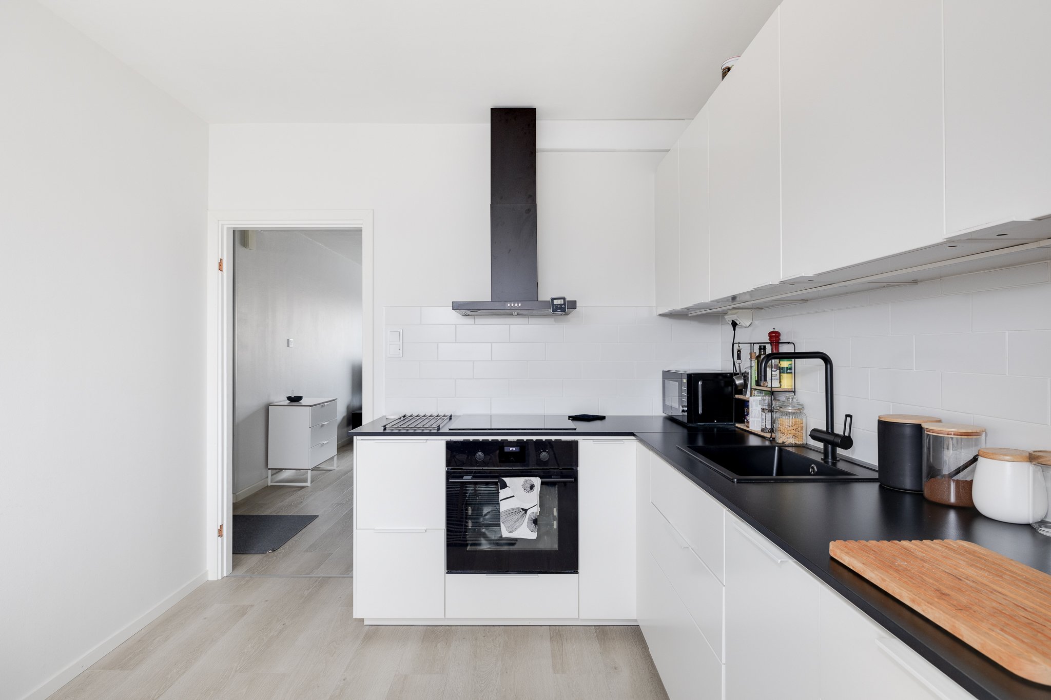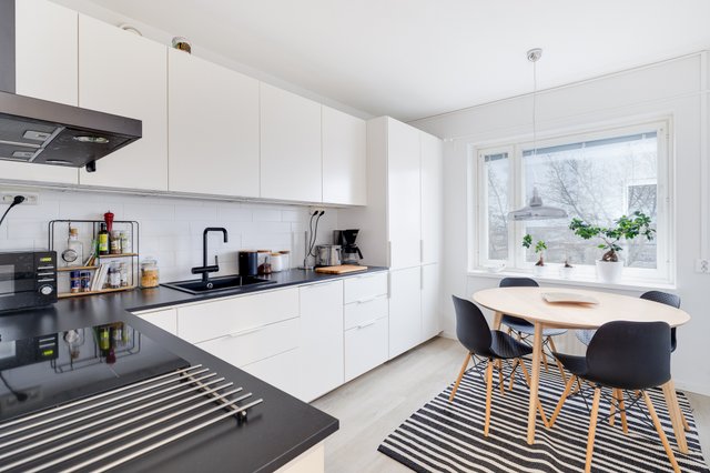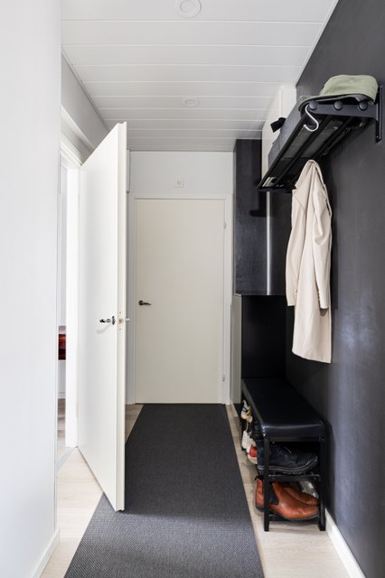 Köket är välutrustat med bland annat induktionshäll och integrerad kyl-frys. Golvvärmen i badrummet ger extra komfort i vardagen, och tvättmaskinsanslutningen underlättar tvättbestyren. Det finns även en separat klädkammare som erbjuder gott om förvaringsutrymme.