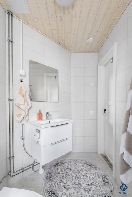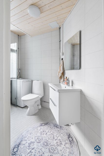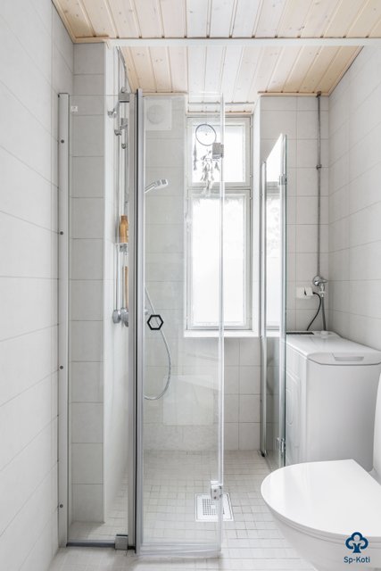 - WC-istuin, suihku, pesukoneliitäntä, suihkuseinä, allaskaappi, peili, lattialämmitys, bidee-suihku, ja ikkuna