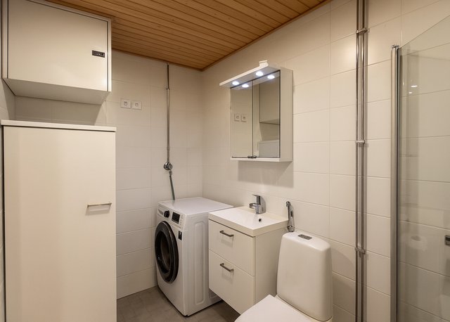 - WC-istuin, suihku, suihkuseinä, pesukoneliitäntä, peilikaappi, pesuallas, allaskaappi, bidee-suihku, ja lattialämmitys