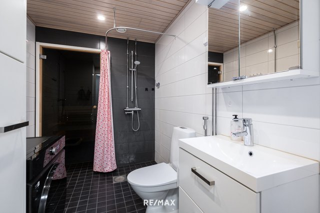 - WC-istuin, suihku, pesukoneliitäntä, pesuallas, bidee-suihku, peilikaappi, ja allaskaappi