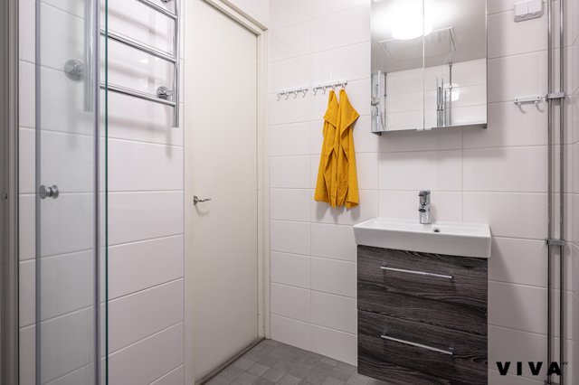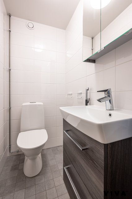 - Suihku, suihkukaappi, pesukoneliitäntä, peilikaappi, pesuallas, ja allaskaappi