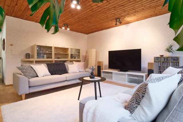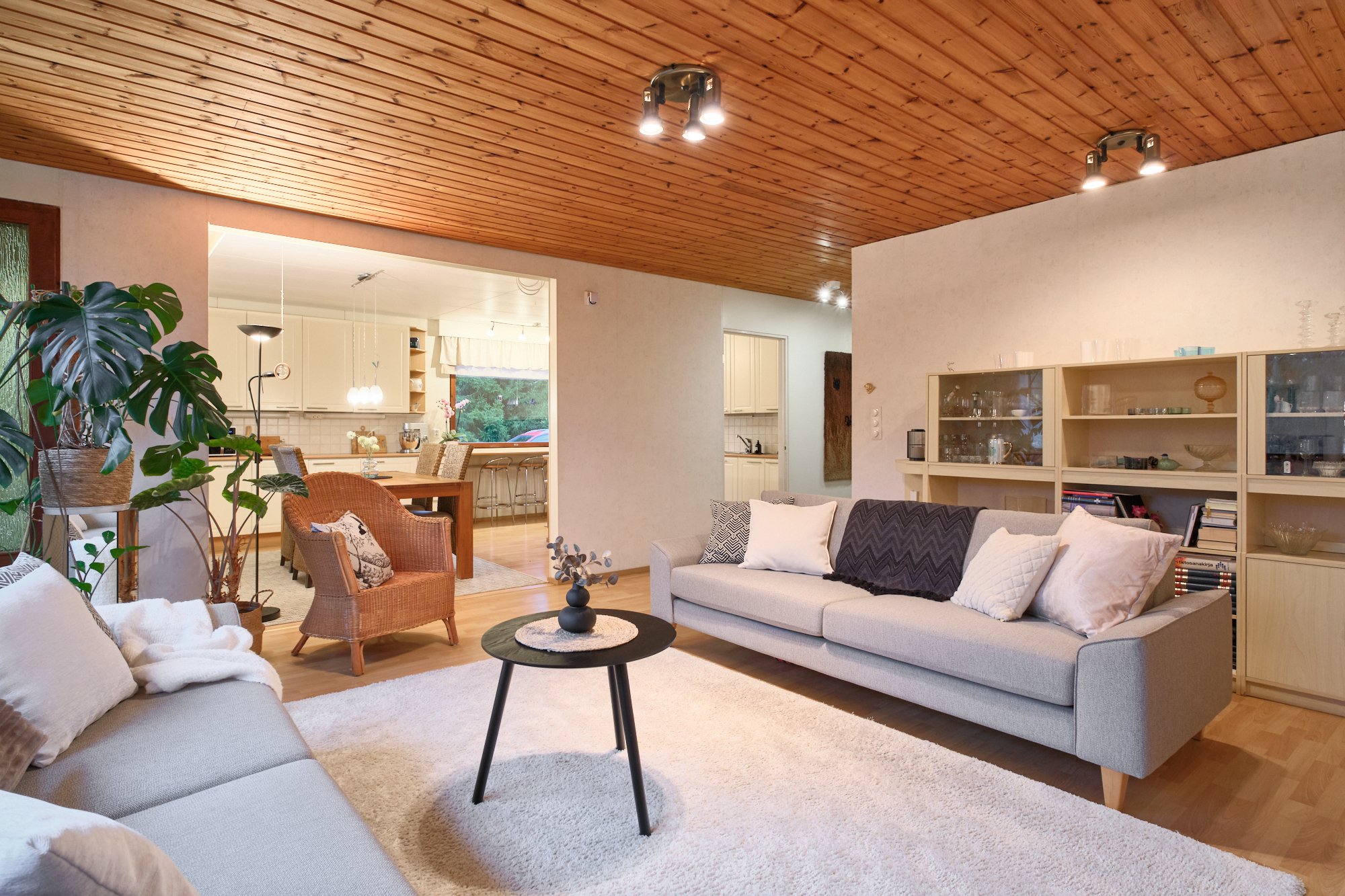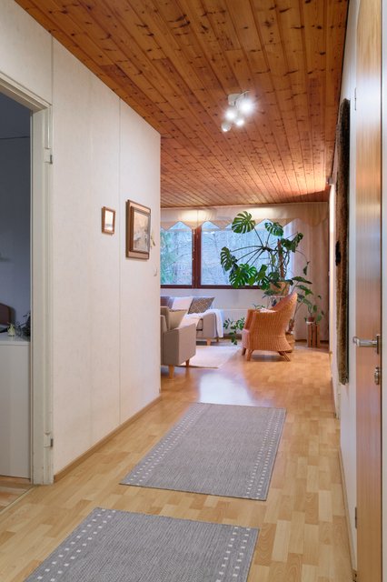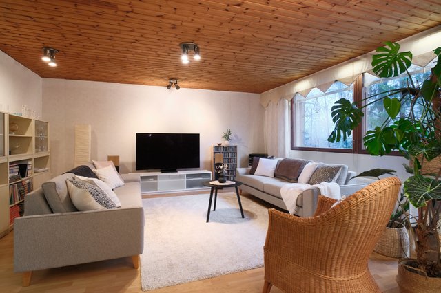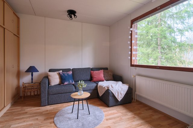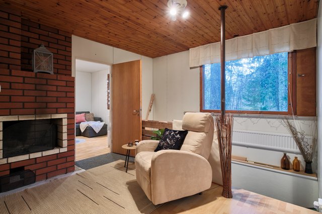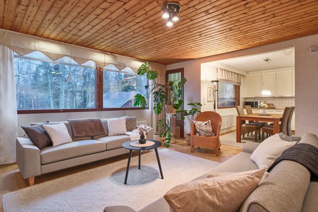 - Isojen ikkunoiden kautta avautuu maisema joelle, metsään ja omalle piha-alueelle. Olohuoneessa on tilaa erilaisille sisustusratkaisuille. Olohuoneesta on käynti parvekkeelle.