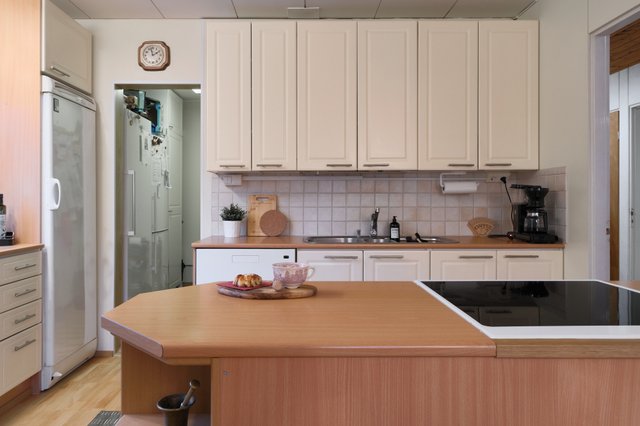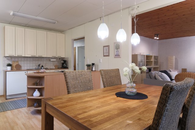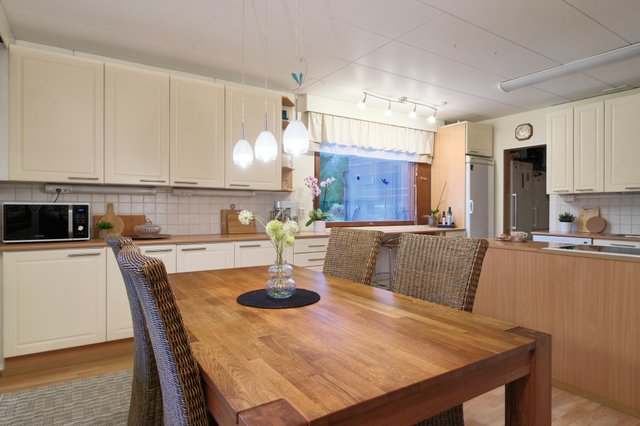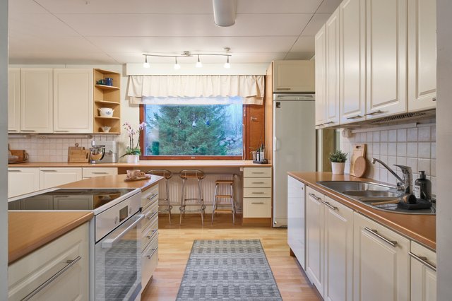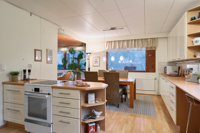 - Tässä keittiössä on runsaasti pöytätasopintaa, jolloin useampi niin isompi kuin pienempikin kokki pääsee yhdessä puuhastelemaan ruuanlaiton tai leipomisen parissa. Keittiö ja ruokailuhuone muodostavat yhteisen avaran tilan, joka yhdistyy luontevasti ison olohuoneen kanssa. Luonnonvaloa tilaan tarjoavat isot ikkunat. Säilytystilat niin kaapistoissa kuin kylmätiloissakaan eivät heti lopu kesken. Entisestä kylmiöstä on tehty keittiöön lisäsäilytystilaa kylmäkoneille ja tavaroille. Keittiö on remontoitu kauttaaltaan 2003.