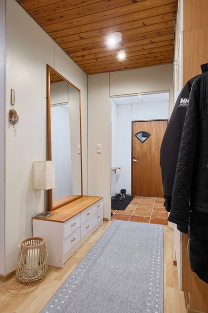Asuintiloista löytyy kolme makuuhuonetta, joista yksi on varustettu vaatehuoneella ja omalla wc:llä, mikä tarjoaa mukavuutta ja yksityisyyttä. Olohuoneen suuret ikkunat avaavat näkymät joelle ja metsään, ja sieltä on käynti parvekkeelle, josta voi nauttia rauhallisista hetkistä ulkoilmassa. Keittiö ja ruokailutila muodostavat avaran kokonaisuuden, jossa on runsaasti tilaa ruoanlaittoon ja yhdessäoloon.
