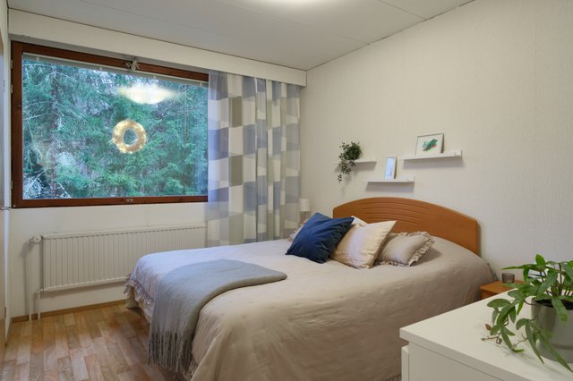 - Kolme erillistä makuuhuonetta, jotka sijaitsevat erillään toisistaan. Yhden makuuhuoneen yhteydessä on sekä vaatehuone että oma erillinen wc. Ns. päämakuuhuoneen yhteydessä on tilava vaatehuone, johon on käynti sekä eteisestä että makuuhuoneesta.