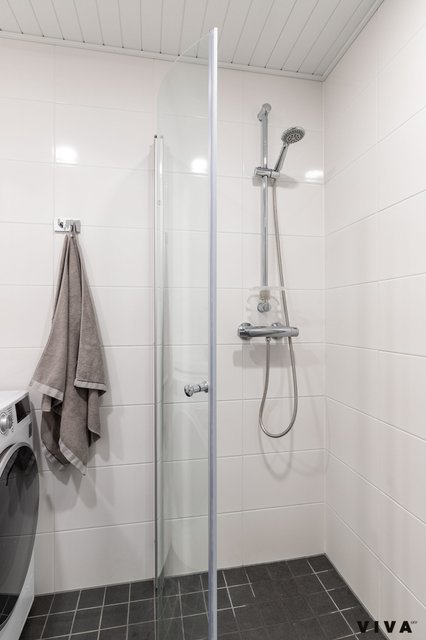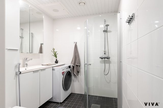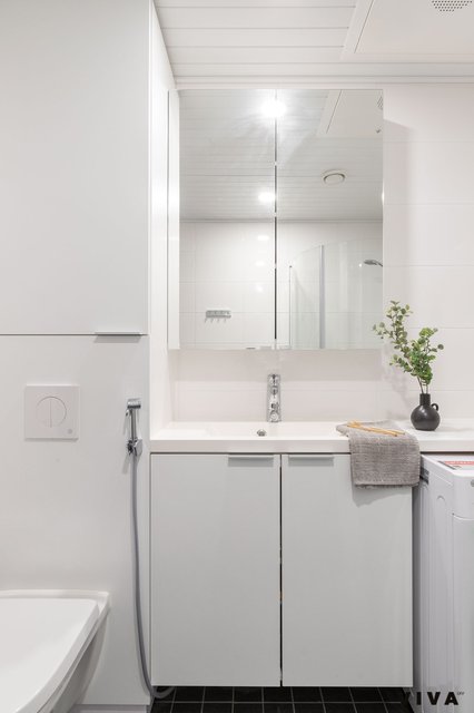 - Bidee-suihku, suihkuseinä, suihku, pesukoneliitäntä, lattialämmitys, peilikaappi, allaskaappi, pesuallas, ja wc-istuin