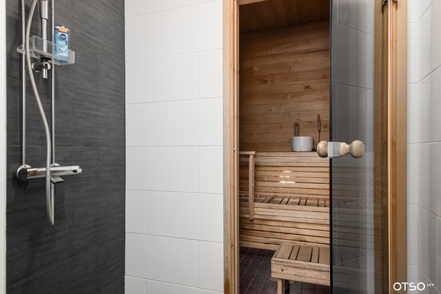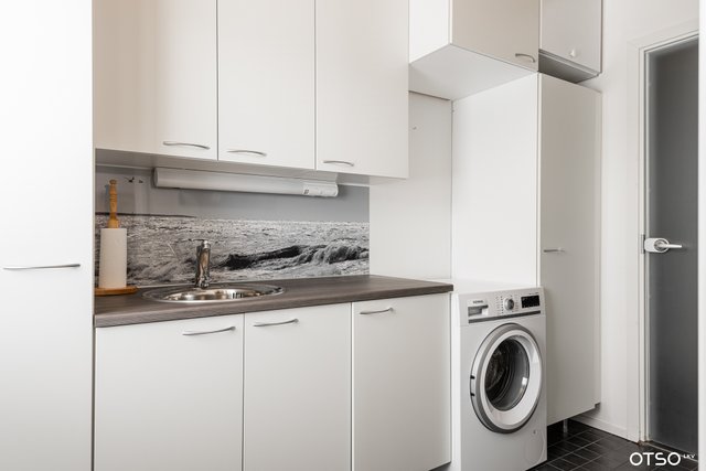 - Pesukoneliitäntä, lattialämmitys, pyykkikaapit, pesuallas, ja pöytätaso