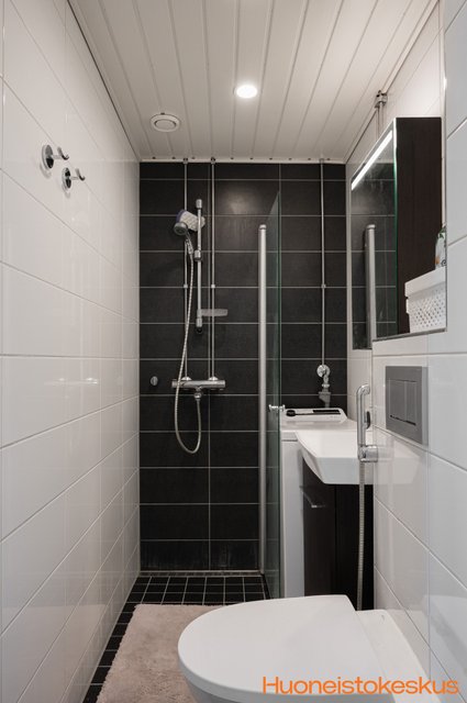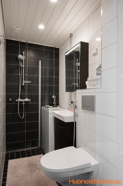 - WC-istuin, suihku, peilikaappi, allaskaappi, bidee-suihku, pesukoneliitäntä, ja suihkuseinä